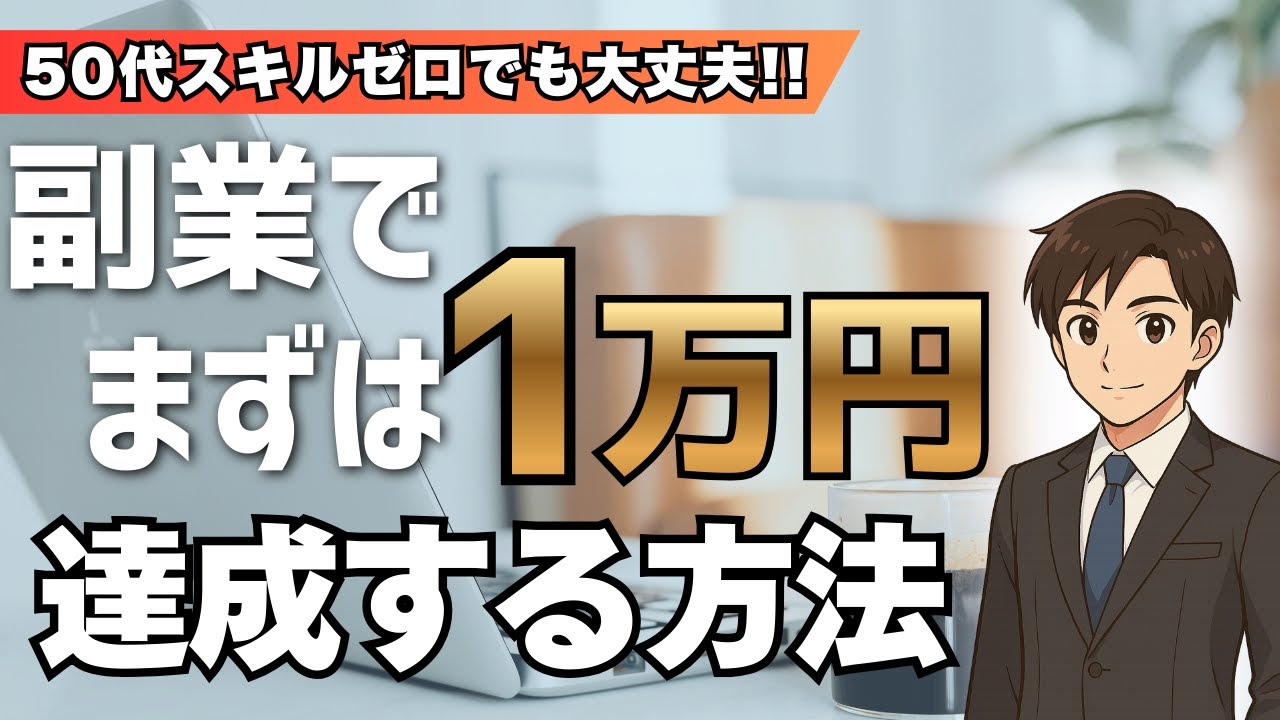 この動画ではAI副業を始める50代の方に向けて、まずAI副業で月1万円の収入を最速で達成する方法、考え方について紹介しています。